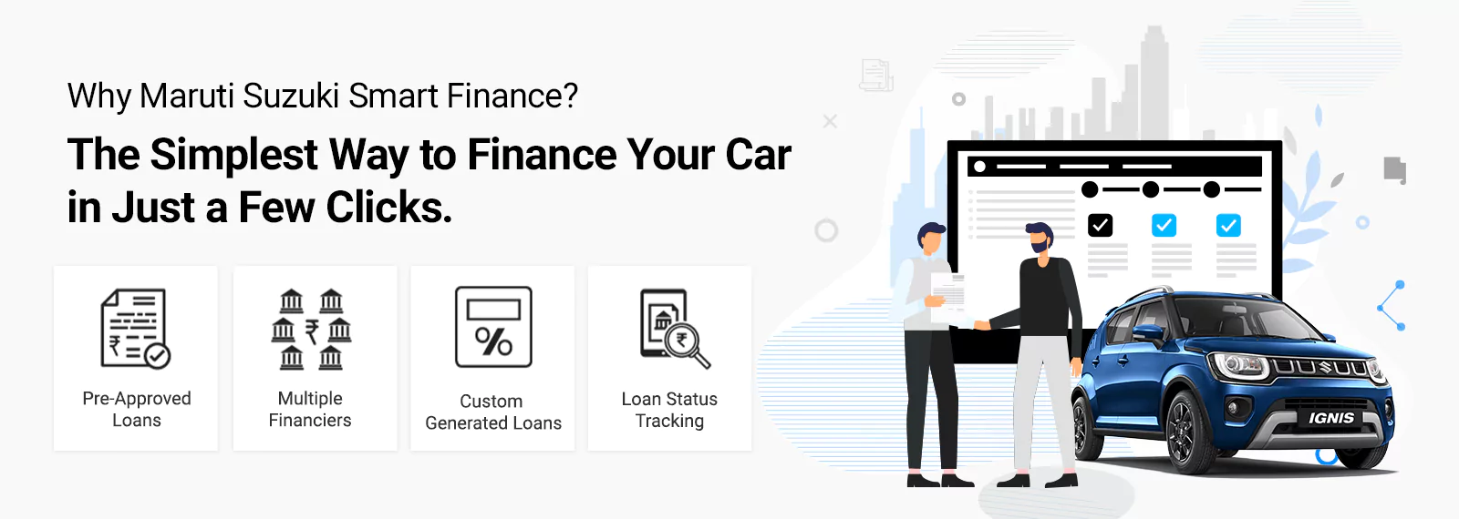 Maruti Suzuki Smart Finance is an one-stop solution for all customer financing needs. It's an end to end digital auto financing platform where the customer can view, compare and apply for a loan of their choice. The customer can also derive his on-road price (by selecting accessories, insurance etc. as per the need) and track the loan application in real time. Maruti Suzuki Smart Finance is India’s first Online and end to end car finance platform providing an easy and convenient car financing solution to the Car buyer.